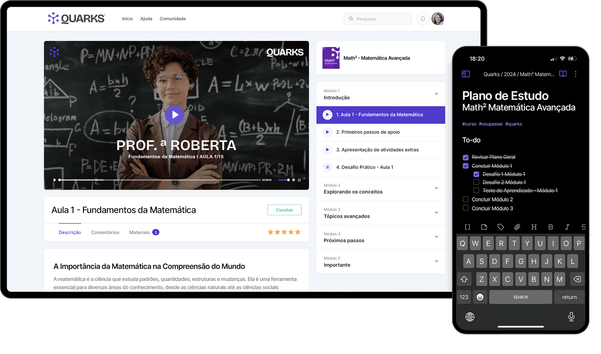 O Acompanhamento Escolar do Quarks foi pensado para estudantes que desejam fortalecer o aprendizado e/ou melhorar o desempenho em Física, Química, Matemática e Português. Com aulas orientadas para que o estudante tenha autonomia e aprenda a estudar sozinho, explicações claras e suporte contínuo, ajudamos o aluno a superar dificuldades, ganhar confiança nas disciplinas e manter uma rotina de estudos mais eficiente ao longo do ano letivo.